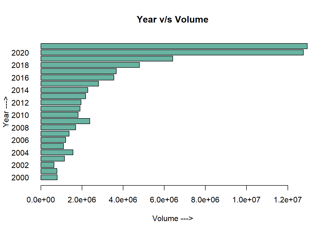 3. Special attention can be paid to volumes of stock sold between 2018 - 2021. There is a sharp increase in the volume of shares traded. Due to the COVID-19 pandemic, many stocks fell which encouraged more people than ever to open a demat account and start investing( I opened mine during this time!!!)